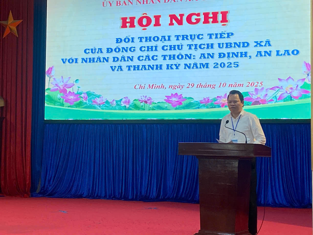 Sáng ngày 29/10/2025, tại Hội trường UBND xã Chí Minh (thôn Thanh Kỳ), UBND xã Chí Minh đã tổ chức Hội nghị đối thoại trực tiếp giữa đồng chí Chủ tịch UBND xã với Nhân dân các thôn An Định, Thanh Kỳ và An Lao. Dự hội nghị tiếp xúc, đối thoại có các đồng chí Dương Hà Hải – Bí thư đảng uỷ, Chủ tịch HĐND xã, cùng các đồng chí trong ban thường vụ Đảng uỷ tham dự.