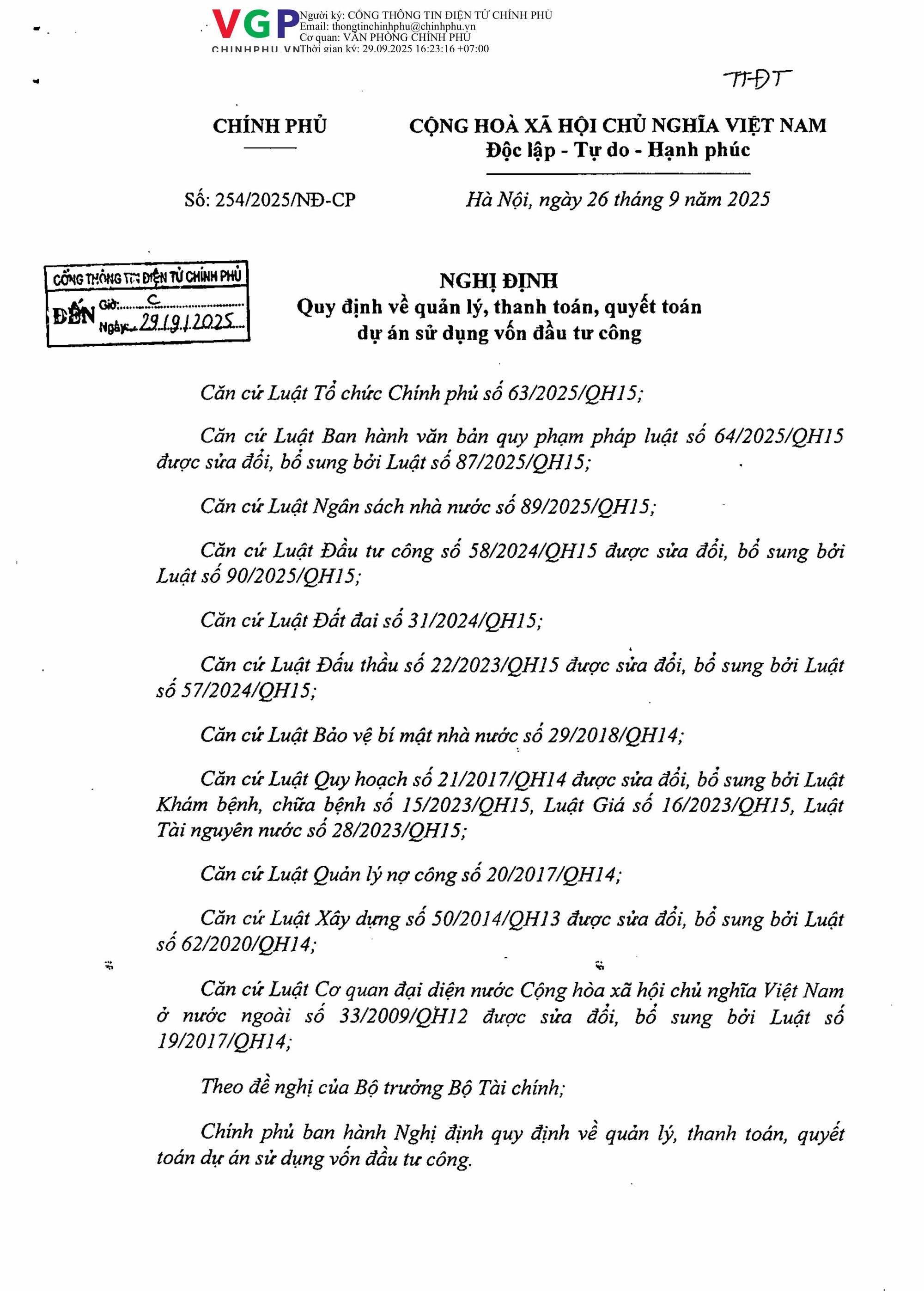 TOÀN VĂN: Nghị định số 254/2025/NĐ-CP ngày 26/9/2025 của Chính phủ quy định về quản lý, thanh toán, quyết toán dự án sử dụng vốn đầu tư công.