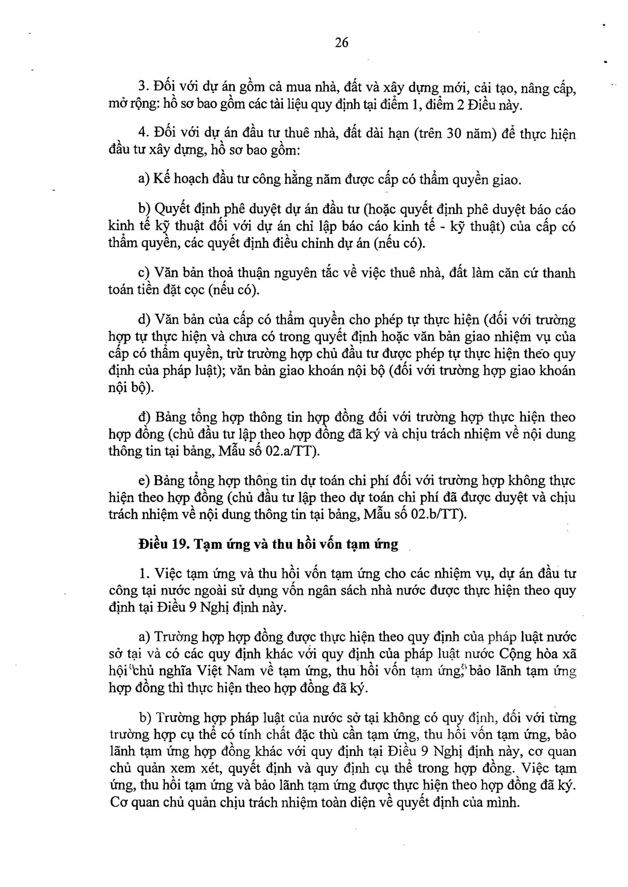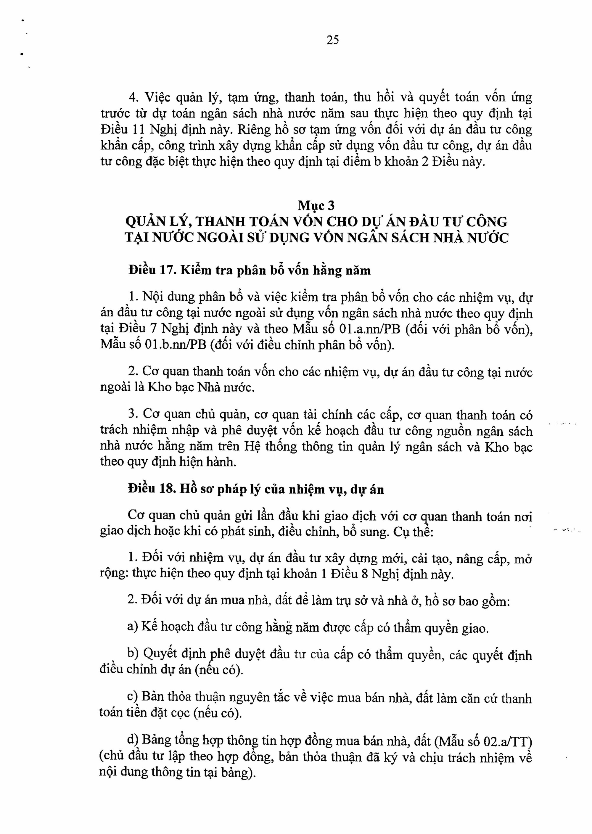 Đối với dự án đầu tư công tại nước ngoài, hợp đồng đã ký kết, pháp luật hiện hành của nước sở tại, điều ước quốc tế mà nước Cộng hòa xã hội chủ nghĩa Việt Nam là thành viên và pháp luật hiện hành của nước Cộng hòa xã hội chủ nghĩa Việt Nam là căn cứ pháp lý thực hiện quản lý, giải ngân vốn cho dự án đầu tư công tại nước ngoài. Cơ quan chủ quản thay mặt chủ đầu tư đề nghị và thực hiện giao dịch thanh toán vốn đầu tư công với cơ quan thanh toán.