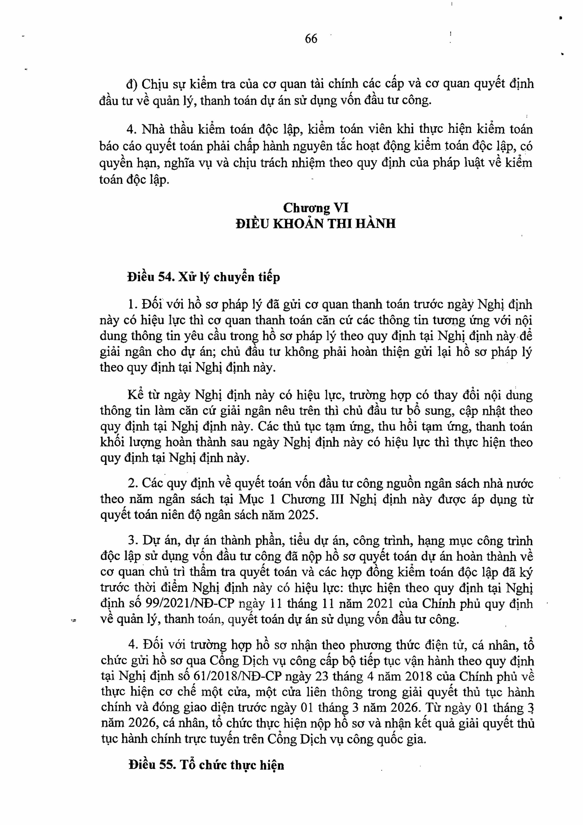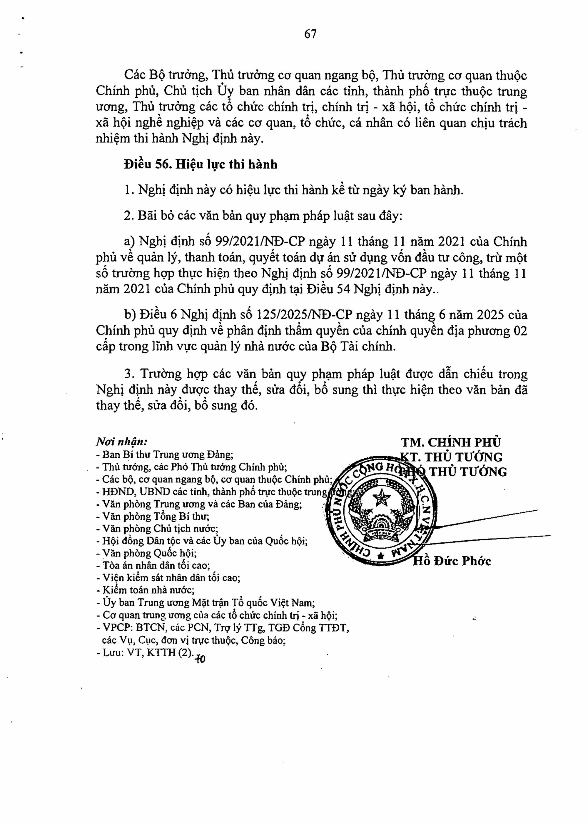 Bãi bỏ Nghị định số 99/2021/NĐ-CP ngày 11/11/2021 của Chính phủ về quản lý, thanh toán, quyết toán dự án sử dụng vốn đầu tư công (trừ một số trường hợp thực hiện theo Nghị định số 99/2021/NĐ-CP ngày 11/11/2021 của Chính phủ quy định tại Điều 54 Nghị định này); Điều 6 Nghị định số 125/2025/NĐ-CP ngày 11/6/2025 của Chính phủ quy định về phân định thẩm quyền của chính quyền địa phương 02 cấp trong lĩnh vực quản lý nhà nước của Bộ Tài chính.