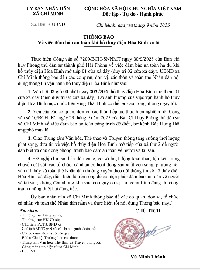 THÔNG BÁO CỦA UBND XÃ Về việc đảm bảo an toàn khi hồ thủy điện Hòa Bình xả lũ